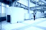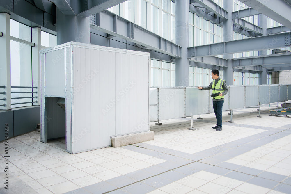 Worker inspecting equipment enclosure inside industrial factory building