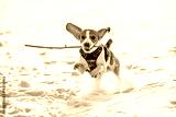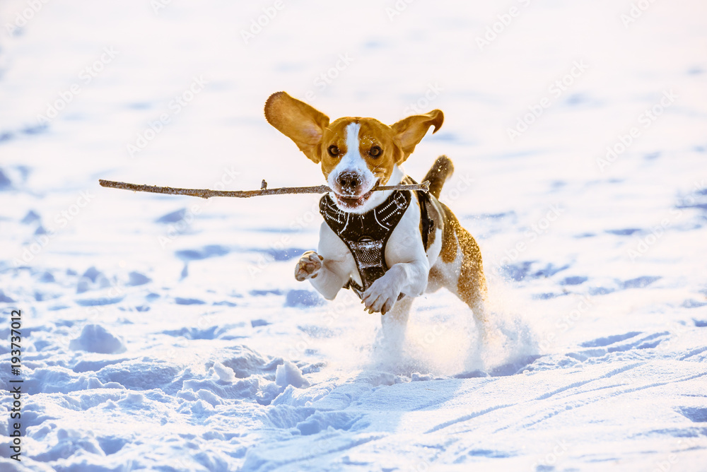 Beagle dog runs with a stick towards camera in a winter sunny day. Canine concept, snowy landscape.