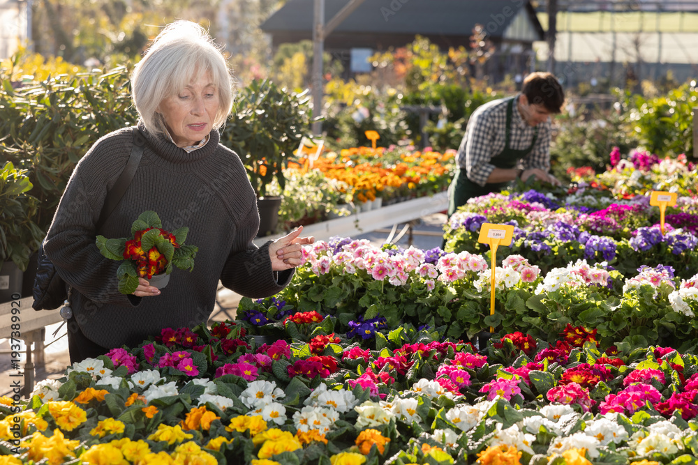 Senior woman customer chooses young houseplant in store, examine leaves and shoots of primula, inhales fragrance of flower. Freelance florist buys potted flowers to create green area in apartment
