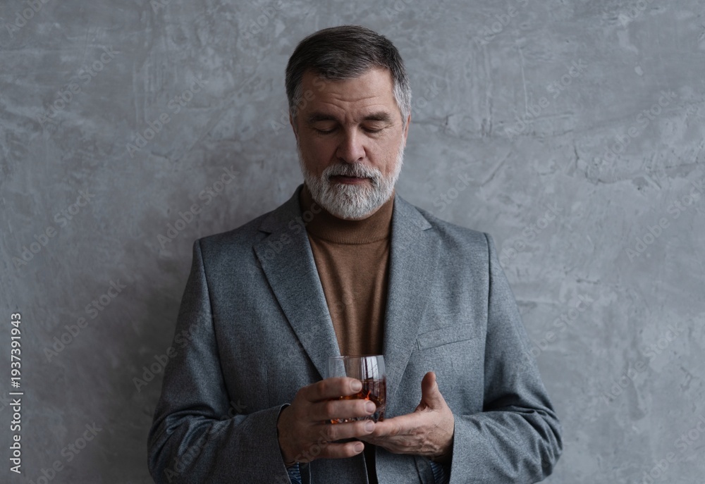 Confident mature businessman chilling relaxing drinking enjoying whiskey against grey wall.