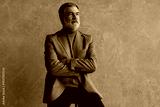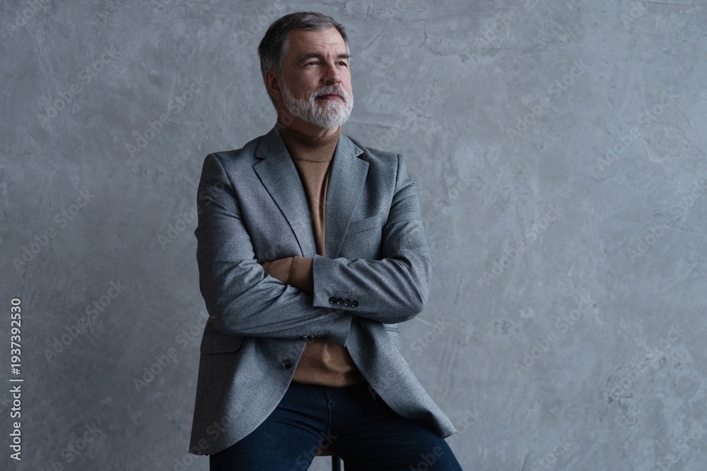 Entrepreneur in jacket smiling, Happy mid adult, mature age man standing, smiling, isolated on grey background