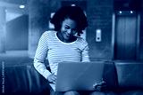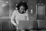 Smiling young African college student using a laptop on campus