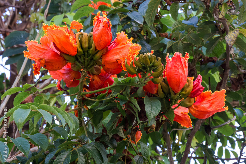tulip tree red flowers close up natural African plant