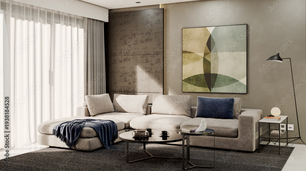 Large luxury modern bright interiors Living room mockup illustration 3D rendering Generated Color Image