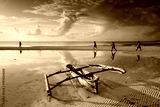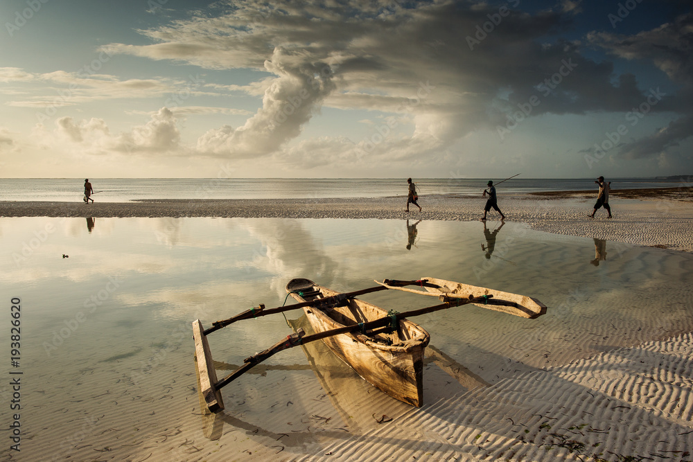 Fishermen going on ocean on traditional fishing boat in Zanzibar with storm clouds at sunrise