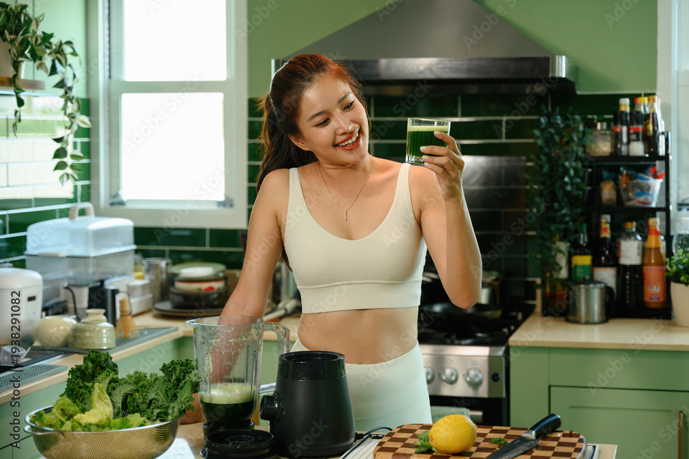 Healthy lifestyle scene with an Asian woman enjoying a nutritious green smoothie after blending fresh ingredients
