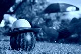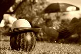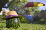Happy summertime in the garden. A straw hat on a watermelon and a girl relaxing in a hammock in the background.
