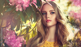 Beautiful spring model girl in flowers in summer blossom park. Woman in a blooming garden . Fashion, Cosmetics & Perfumes . Curly blonde hair