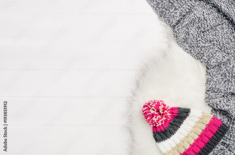 White planks with wood texture pattern and fur background with copy space. Horizontally oriented planks. Top view or aerial view