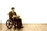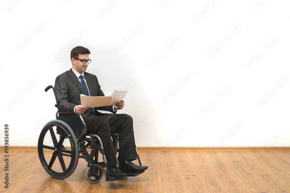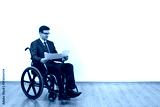 The smile disabled in the wheelchair holding papers on the white wall background