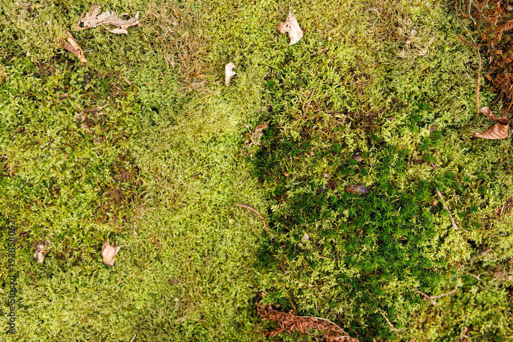 Close up of lush green moss with dry leaves creating a beautiful natural background texture, perfect for designs and con