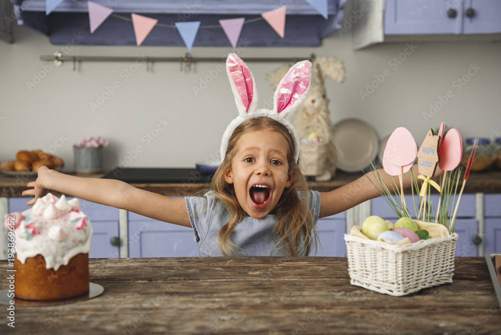 Portrait of cheery little girl in bunny ears headband standing at kitchen table with easter cake and basket with eggs and screaming with outstretched arms