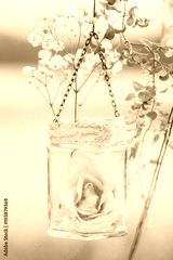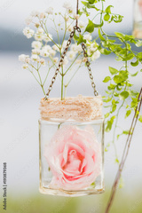 Wedding decoration, rose in transparent hanging jar, white and pink flowers, rustic style
