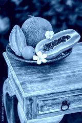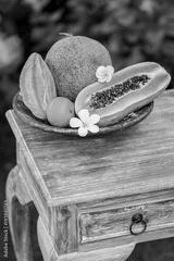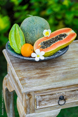 Fruit plate with fresh Bali fruits papaya, orange, melon and star fruit on wooden vintage table in tropical garden. Frangipani flowers
