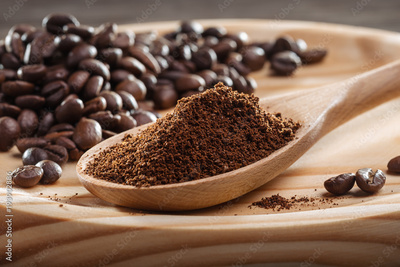 Ground coffee in spoon. Coffee beans.