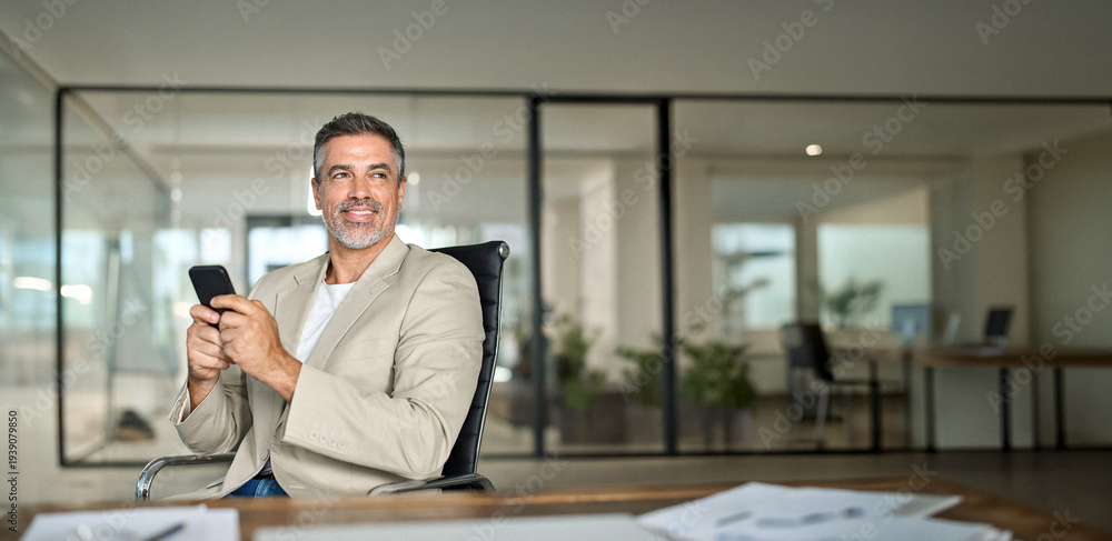 Happy busy middle aged business man investor wearing suit sitting in office using mobile cell phone. 50 years old businessman professional entrepreneur banker holding smartphone looking away at work.