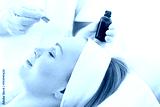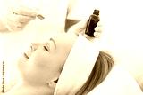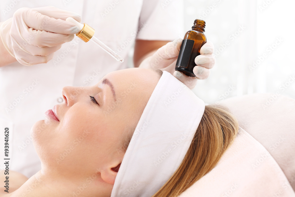 Olejek do twarzy. Kosmetyczka nakłada kosmetyk na skórę twarzy