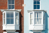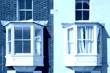Abstract view of a pair of bay windows seen on semi detached townhouses in the UK which overlook a seaside setting on the Suffolk coast.