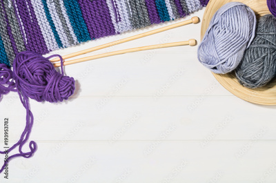 Top view of colorful knitting yarn balls and needlework accessories on white wooden textured table background. Photograph taken from above with copy space around products