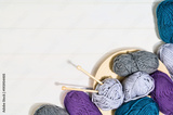 Top view of colorful knitting yarn balls and needlework accessories on white wooden textured table background. Photograph taken from above with copy space around products