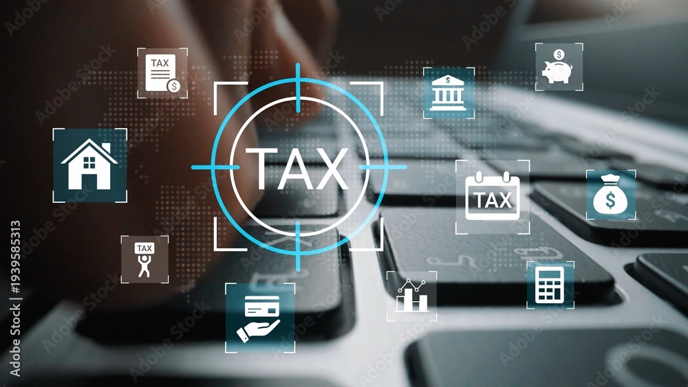 Digital keyboard close-up with tax icons and symbols, depicting financial transactions, accounting process, and software technology in modern economy Gluon.