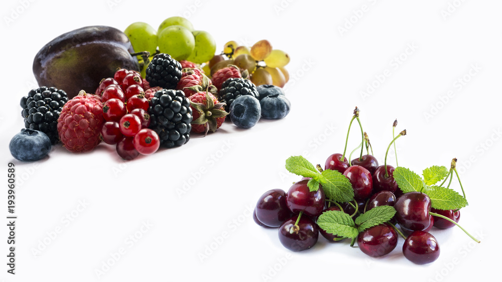 Set of fresh fruits and berries. Various fresh summer berries on white background. Berries and fruits with copy space for text. Background berries.