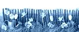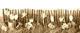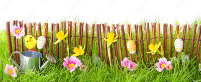 Ostern, Banner, Hintergrund -- Blumenwiese mit Holzzaun, Küken, Blumen und Gießkanne