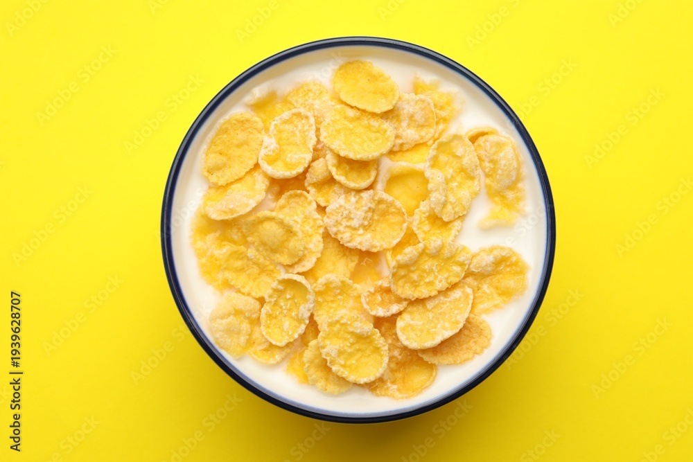 Tasty corn flakes with milk in bowl on yellow table, top view