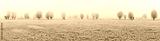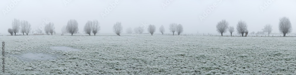 Panorama of fields with willow trees in winter