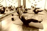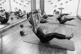 Sporty girls holding up pilates rings over their heads while doing abdominal exercise in the gym.