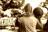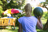 Young blonde woman holding a watermelon and carrying it to a garden party.