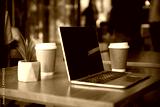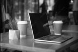Laptop with takeaway coffee cups on wooden table in modern cafe workspace