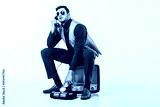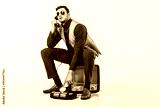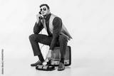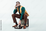 handsome retro styled man sitting on vintage television and talking by stationary telephone