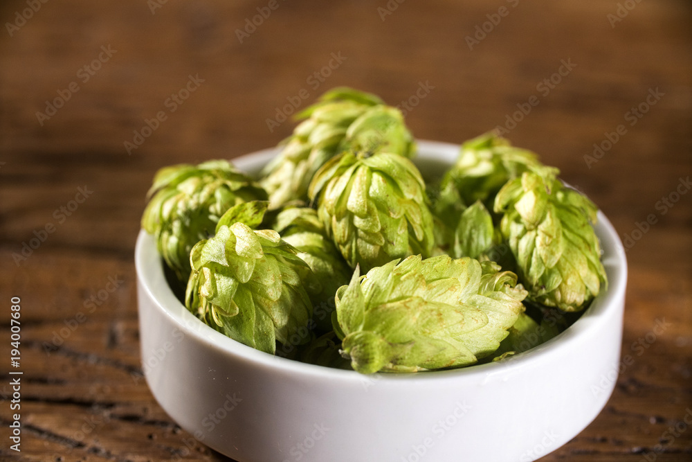 Beer brewing ingredients Hop cones in white bowl on wooden background. Beer brewery concept.