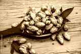 Beer brewing ingredients Hop cones in wooden bowl and wheat ears on wooden background. Beer brewery concept.