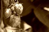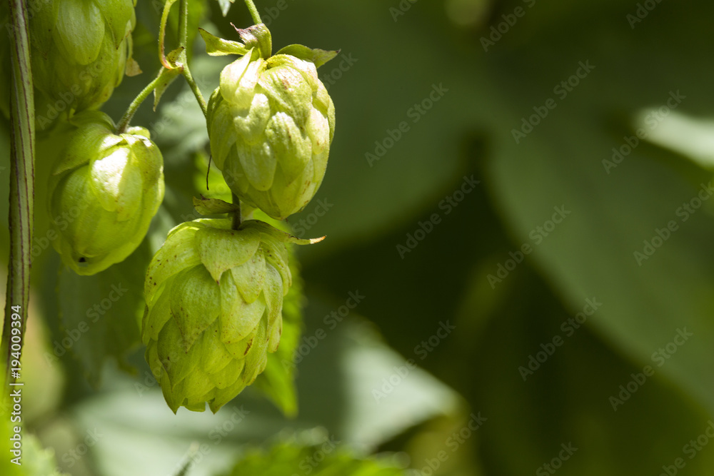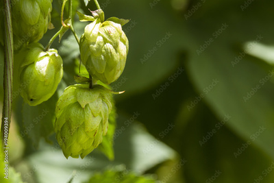 Green fresh hop cones for making beer and bread closeup, agricultural background.