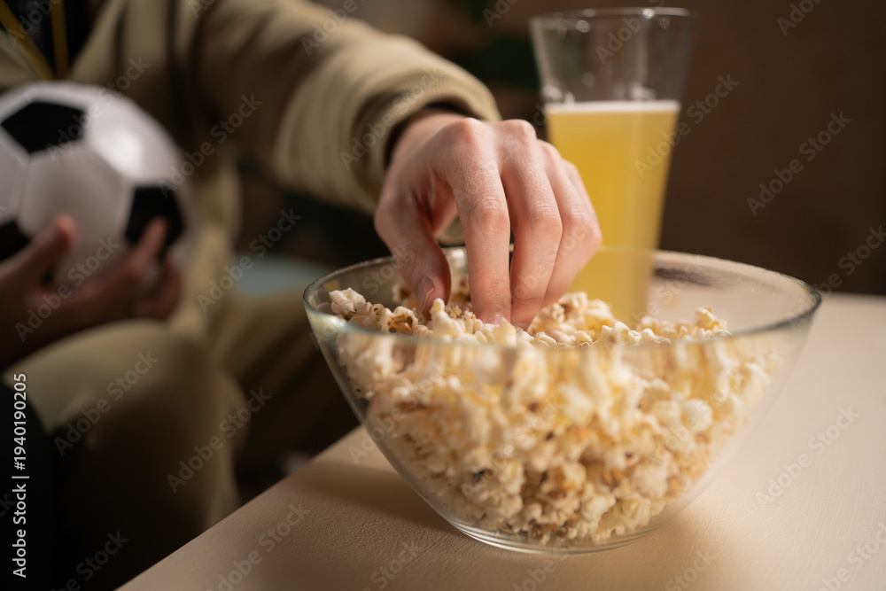 Close up of football fan hands holding soccer ball and taking popcorn from glass bowl