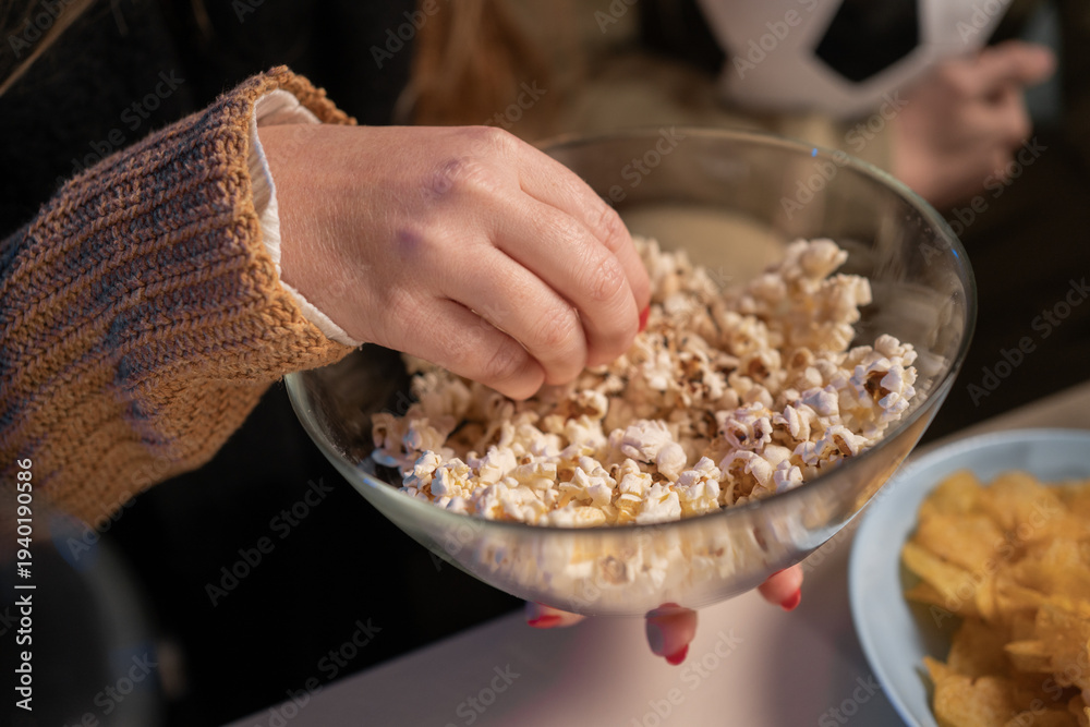 Close-up of female hands holds popcorn while watching a football match with snacks at home