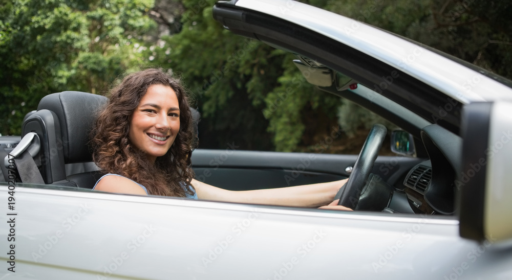 Woman wearing blue top sitting in silver convertible top down in park, reaching wheel, smiling