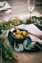 Green olives in an aromatic herb marinade. Mediterranean-table decoration for a appetizer. Vertical background