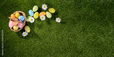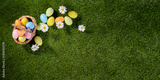 above top view of multi colored painted easter eggs on the green grass with springtime daisy flowers