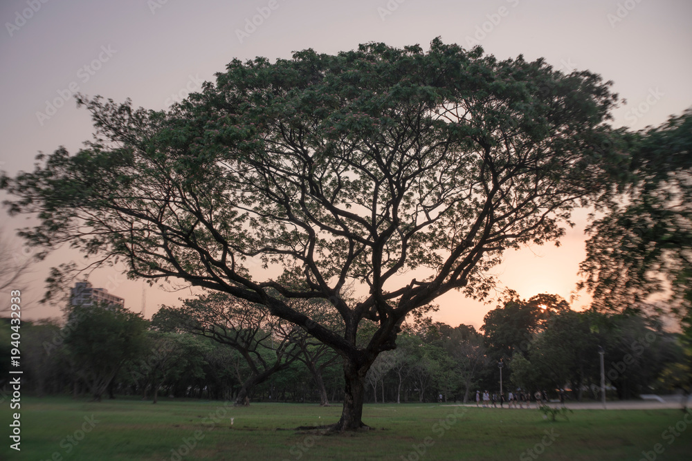 Trees in a peaceful city park at early morning with soft sunlight and fresh atmosphere.
