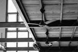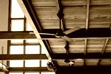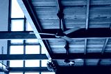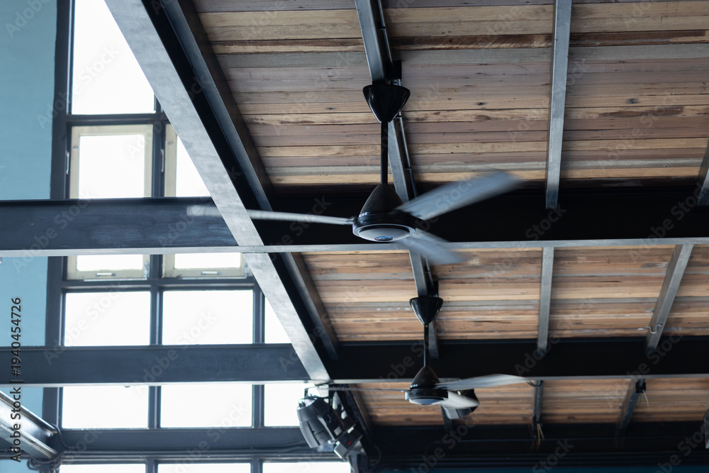 black ceiling fans are spinning on wooden ceiling.