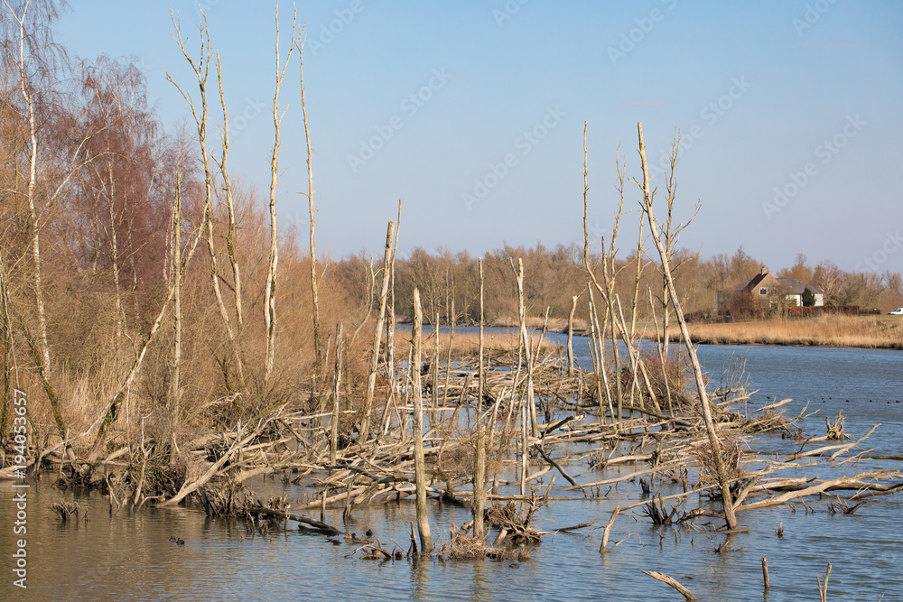 The polders - meadows, water and reed in the Natur Park "Biesbosch" in Holland. Dutch winter landscapes on a sunny day.