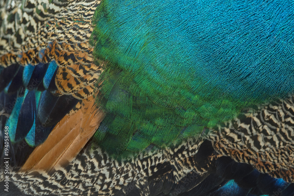 Colorful and beautiful peacock feathers. (Blue peafowl)