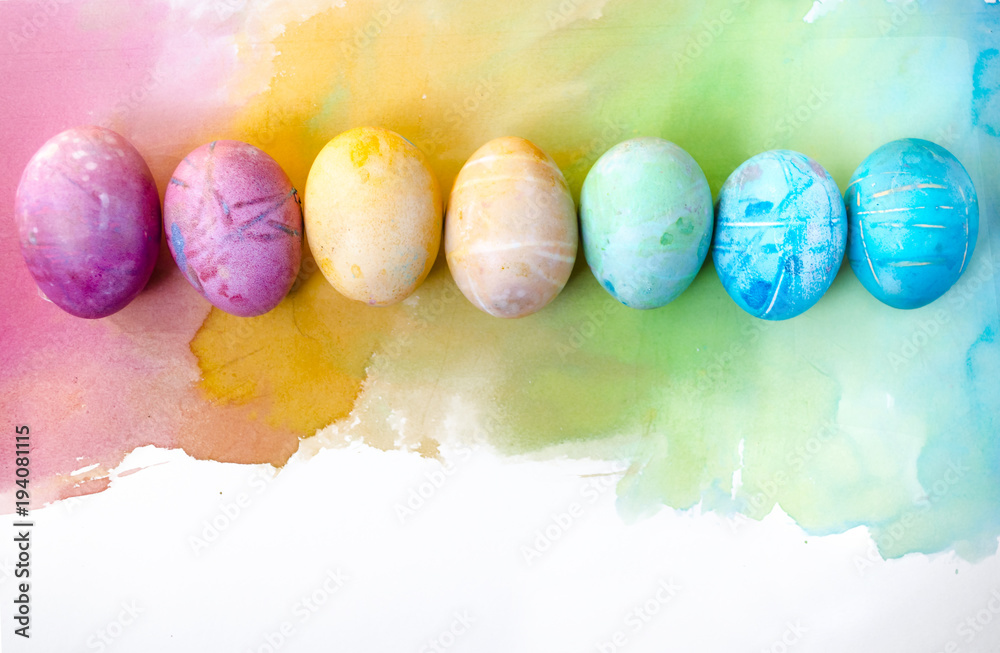Watercolor background with colorful rainbow Easter eggs . Gentle, picturesque spring photocomposition.