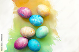 Watercolor background with colorful rainbow Easter eggs . Gentle, picturesque spring photocomposition.