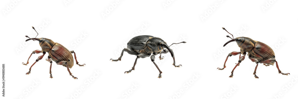 Acorn Weevil Curculio glandium isolated on white background, snout beetle insect, Curculionidae, brown weevil macro set, coleoptera specimen, long rostrum cutout.
