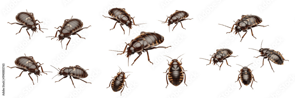 Bed bug set Cimex lectularius collection blood sucking parasites for medical wildlife study and pest control isolated on white background PNG cutout high quality digital asset