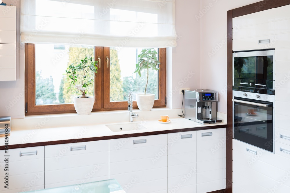 Modern house kitchen with white wooden furnitures